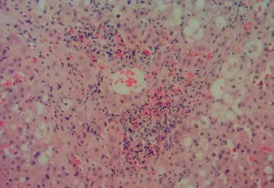 病理见肝脏以3区病变为主,脂肪细胞变性,大泡性为主,肝细胞水肿、气球样变,小叶炎较重,肝纤维化窦周纤维化明显,可见Mallory酒精小体。